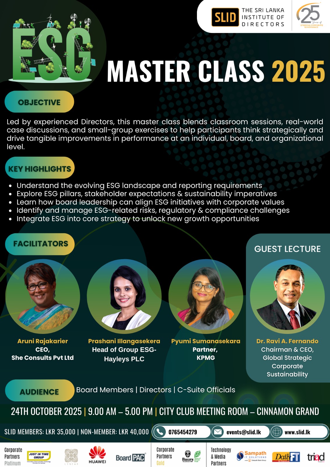 In today’s fast-evolving corporate world, sustainability is no longer optional—it’s essential. The Sri Lanka Institute of Directors (SLID) proudly presents the ESG Master Class 2025, a transformative program designed for leaders who want to stay ahead of the curve. Led by top industry experts and enriched with real-world insights, this master class will empower you to integrate ESG into your boardroom strategy, strengthen governance, and unlock new growth opportunities.