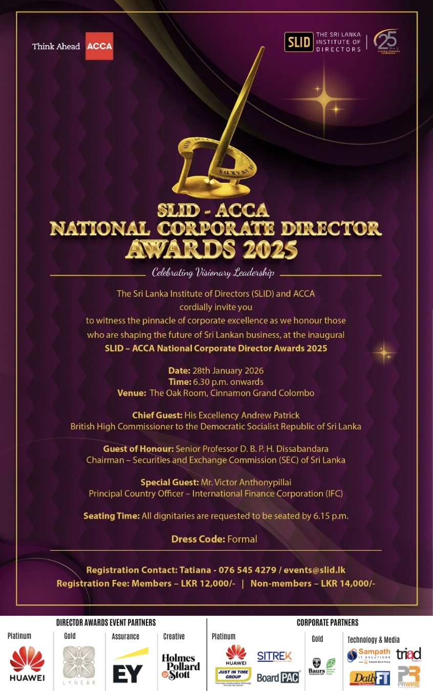 The Sri Lanka Institute of Directors (SLID), in collaboration with ACCA, is proud to present the SLID–ACCA National Corporate Director Awards Ceremony 2025, an evening dedicated to celebrating visionary leadership and corporate excellence.